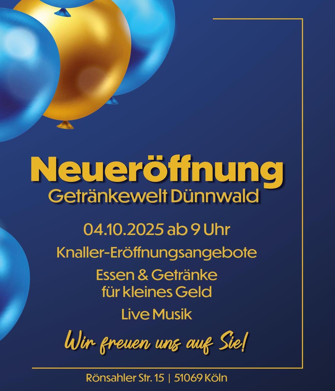 Es ist so weit! Zusammen mit meinem Partner Jan Brautmeier (Mieten-Einfach) übernehmen wir den Getränkemarkt (ex Die Getränkeprofis) in der Rönsaler Str. 15. Die (Wieder-) Eröffnung der Getränkewelt Dünnwald findet am 04.10.2025 ab 9:00 statt. Kommt vorbei. Es gibt tolle Eröffnungsangebote, Essen, Trinken und Livemusik!